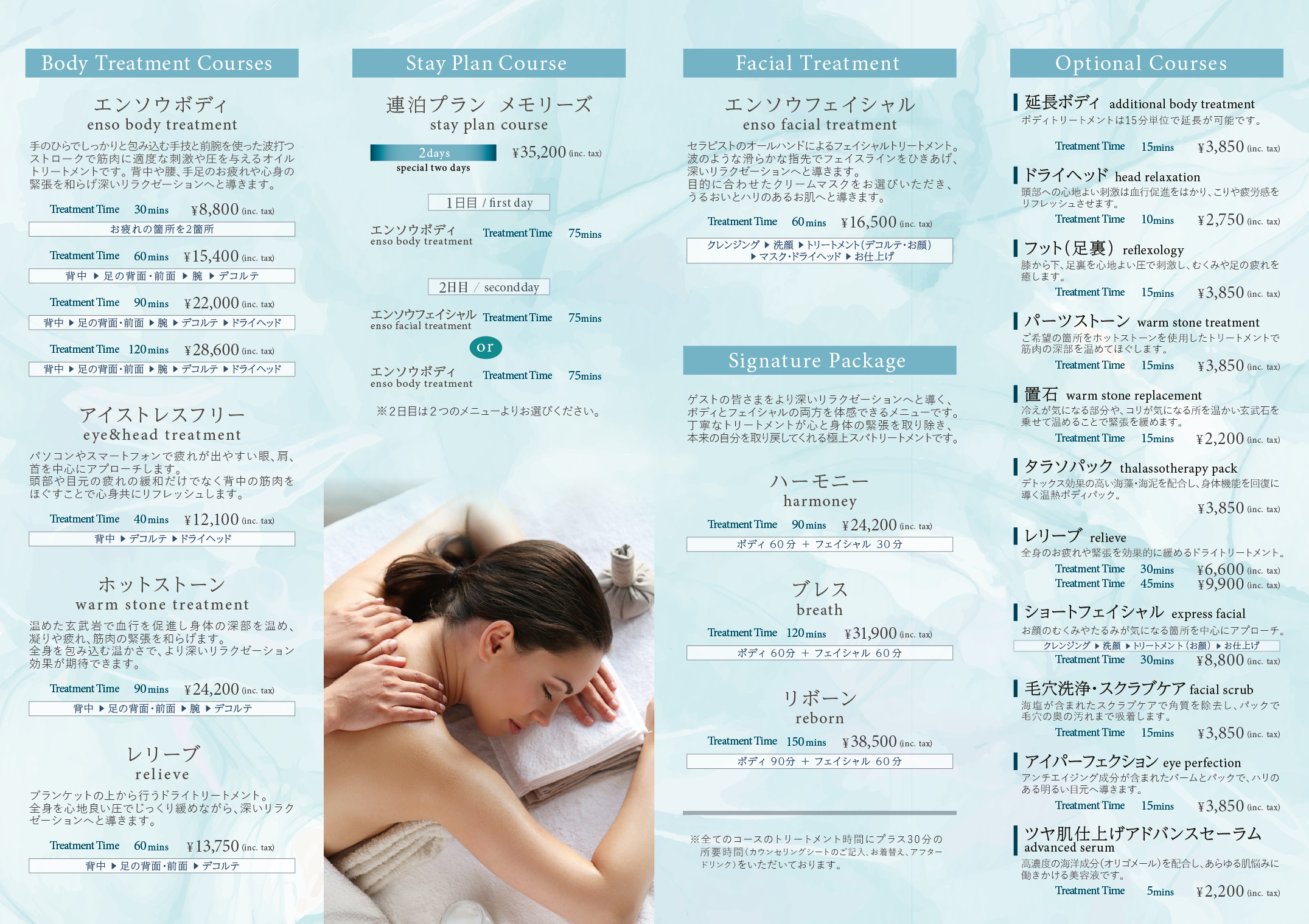 スパのロゴであるenso(円相)は日常のしがらみから解放された 捕らわれの無い心、角がなく、はじまりも終わりもない ありのままの状態を意味します。